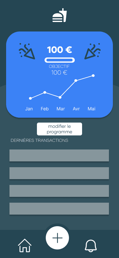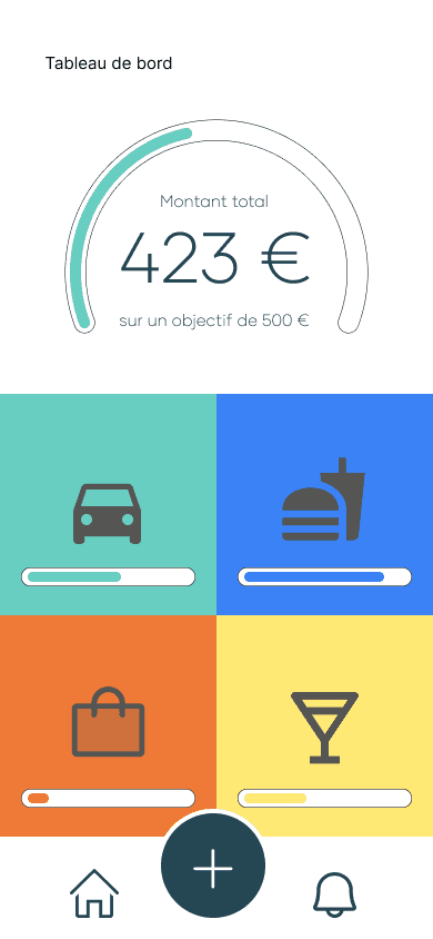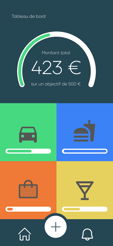 J'ai donc crée un logo composé d'une pièce et d'un smiley afin d'y donner de l'impact et l'ancrer dans l'objectif : toucher les jeunes. J'ai ensuite sélectionné deux couleurs principales ainsi que quatre couleurs secondaires qui représentent l'avancement des objectifs. J'ai enfin choisi d'opter pour un design arrondi et épuré afin de faciliter la lisibilité de l'application.